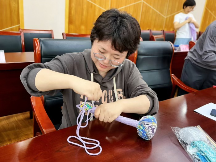 活动伊始,分工会主席简要介绍了端午节的传统习俗以及艾草的养生功效,激发了大家的参与热情。活动现场,艾草的清香弥漫四周,教职工们齐聚一堂,全神贯注地投入到养生艾草锤的制作中。大家将干艾草、艾绒等材料装入提前准备好的布袋,使其填充均匀、紧密后封口,最后用色彩丰富的绳子缠绕手柄并扎紧,一个个结实且饱含心意的养生艾草锤便诞生了。