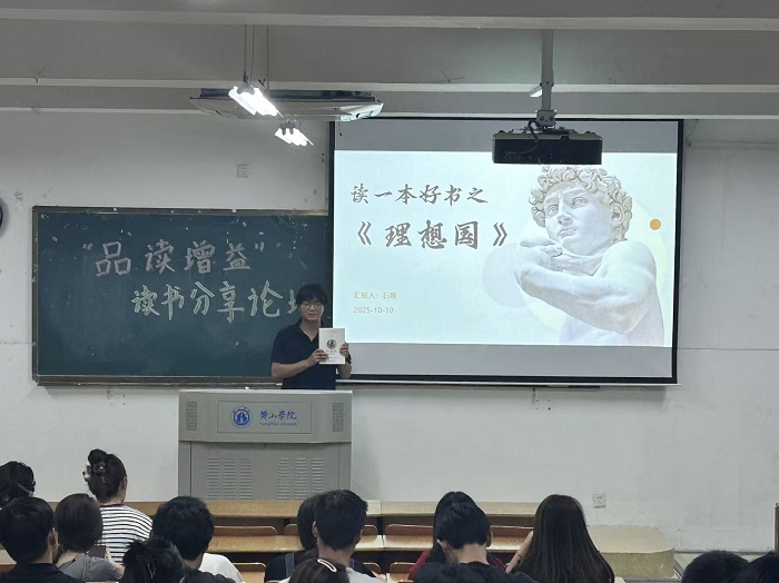 经典领读:深挖书籍思想内核。活动伊始,石燚同学以柏拉图经典著作《理想国》为分享主题,从书籍内容概览、作者生平背景切入,逐步深入阐释“个人与城邦正义”“理想城邦阶层分工”等核心思想,层层递进地传递书中蕴含的哲学智慧与教育理念,彰显了学风建设中“以经典涵养思维”的深层追求。