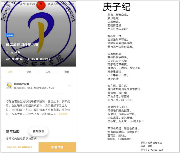 此次原创诗歌活动是该院“共抗疫情,爱国力行”系列活动之一,也是该院培育和践行经管人精神系列活动之一,旨在提高该院学生的创作能力和语言文字表达能力,进一步打造书香经管这一品牌活动。