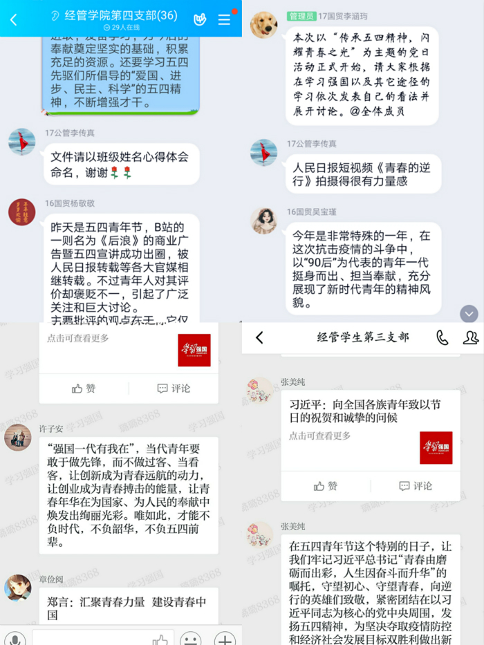 五一期间,党支部全体党员自学人民日报、央视新闻网、人民网、学习强国等关于青年的新闻和先进事迹,并在党日活动会上进行交流分享。三支部学生党员许子安表示,青年一代要听党话,跟党走,要敢于做先锋,而不做过客;四支部学生党员杨敬敬分享了视频《青春的逆行》观后感,表示吃苦耐劳,艰苦奋斗,是任何时代的青年人都应该具备的品质;支部其他党员也通过QQ留言等方式交流了自己的学习体会,交流会反响热烈。