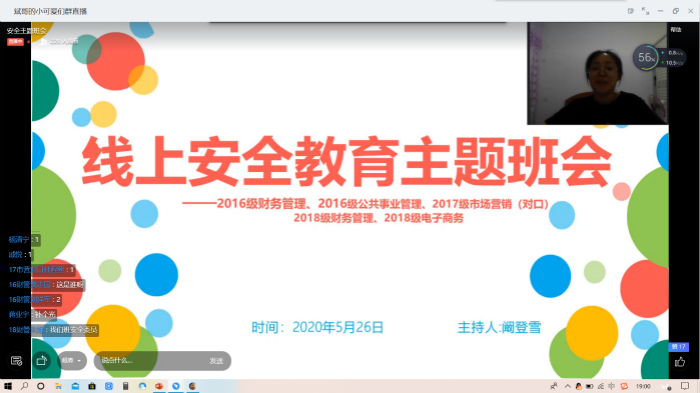 5月26日晚,taptap点点官方网站16级财务管理、16级公共事业管理、17级市场营销对口、18级财务管理以及18级电子商务五个班通过钉钉顺利召开安全主题班会,会议由18财管安全委员阚登雪主持。