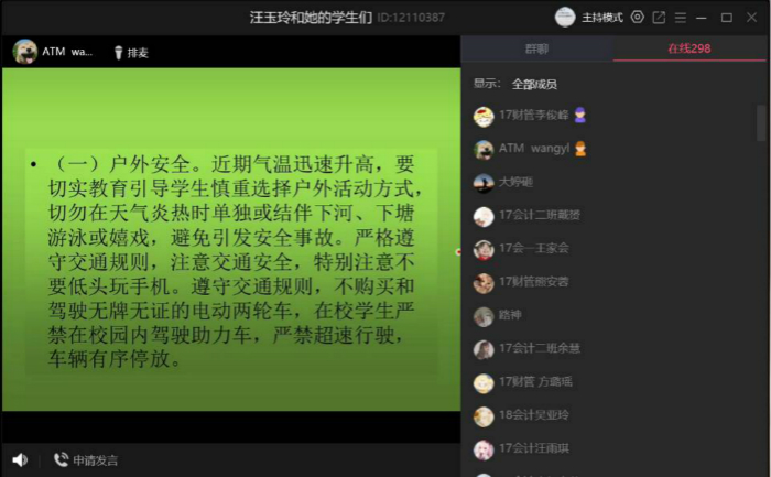 为紧绷学生疫情期间安全弦,5月29日,17财管、17会计和18会计通过QQ群课堂联合召开线上安全教育主题班会,会议由辅导员汪玉玲老师主持。