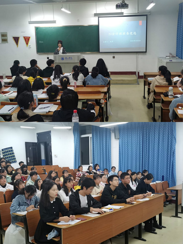 10月25日晚,20会计班于横江校区1303教室召开班委竞选大会,辅导员赵老师、19级班长代表团以及20会计班全体学生参会。
