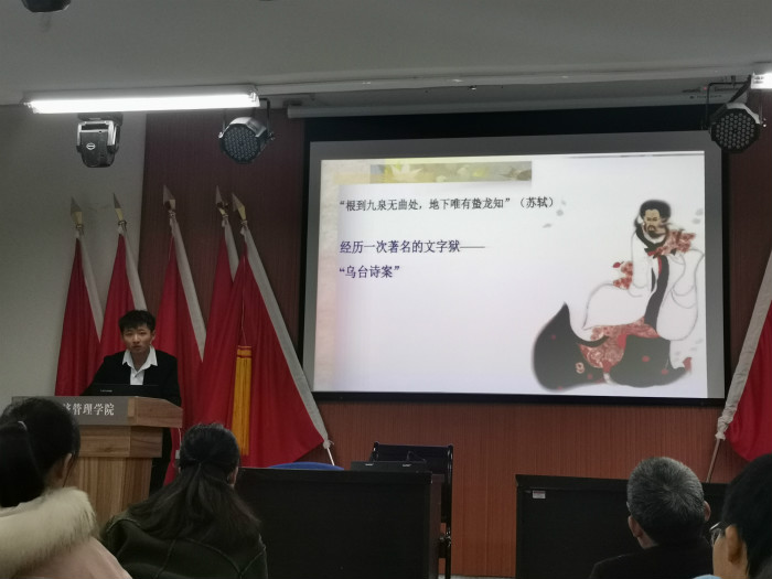 19公管王璐惠子分享的主题为“相逢即缘,何求过多——《长恨歌》&《钗头凤》里的爱情”,她从“相逢、相离、追寻、遗憾和悔恨”几个方面讲述了唐明皇和杨贵妃那段炽热而又凄美的爱情故事。“天长地久有时尽,此恨绵绵无绝期”是他们的爱情写照。“一怀愁绪,几年离索。山盟虽在,锦书难托”,这是对于陆游和唐婉那份剪不断,理还乱“不了情”的浓缩。20财管孙梦雨同学分享了《苏东坡传》所阐释的苏东坡跌宕起伏的传奇人生,他是“大江东去浪淘尽”的豪放诗人,同时也是“十年生死两茫茫”的婉约词者。苏东坡在政治官场上从不趋炎附势,一心为国为民真性情,无论是新党掌权抑或是旧党得势,他总是被贬或者在被贬的路上。儒释道三家合一的他,穷且益坚,不坠青云之志,哪怕是面临绝境也能笑对人生,苦中作乐。