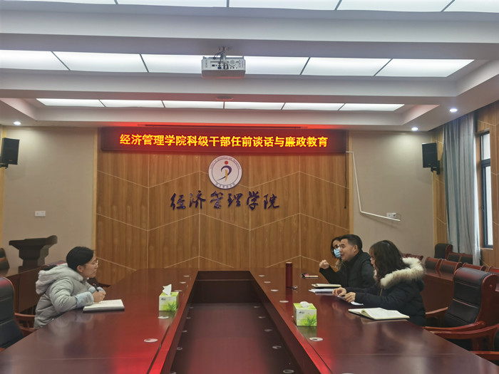 12月18日上午,taptap点点官方网站在横江校区行政楼会议室召开taptap点点官方网站召开科级干部任前谈话与廉政教育会议,学院党委书记胡永政、纪委委员方微、教工党支部书记邱燕、秘书江红以及新任科级干部杨静荣参加任前谈话与廉政教育会议,会议由胡永政主持。