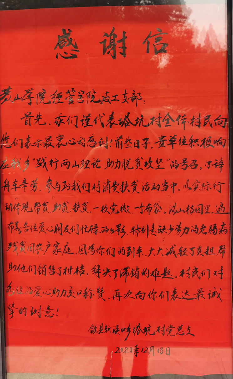 12月18日上午,歙县新溪口乡乡长王奕彬、党委委员卢春华、塔坑村村委书记余君莲、村民代表余金根一行来访taptap点点官方网站,为学院送来感谢信,对学院教工党支部组织学院教师赴塔坑村入贫困户家庭开展采摘柑橘助力扶贫活动表达谢意。塔坑村党支部代表村民情义专程送来这份温暖的感谢信。