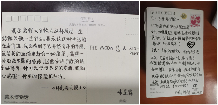 活动中,要求同学们在明信片上写上对已读过的书籍的感悟或体会,或是推荐一本书籍,也或是精彩片段的摘抄,同时也可以借助书写明信片的方式倾诉心事或结交好友,让明信片承载流动的温暖与惊喜打破时间与空间的壁垒。读书会收集明信片后进行筛选,并寄出指定高校。一张满载温暖的明信片寄托的不仅是对书籍的热爱,更是一份传递给陌生友人的问候。