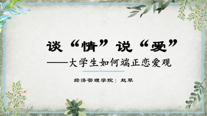 本次主题班会旨在帮助大学生端正自己的恋爱观,了解有关恋爱心理方面的相关知识,树立正确的恋爱观和价值观。尝试学会爱、理解爱、收获爱,成为一个心理健康、思维独立、有爱心有理想的大学生。