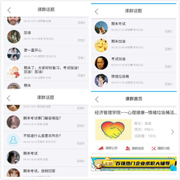 学院通过易班软件创建主题为“丢掉烦恼,拥抱未来”的课群,在各班心理委员、班长的通知宣传下,各班级同学积极参与本次活动。活动中,同学们把近半年里困扰自己的的烦恼和压力等匿名发表在评论区,其他同学对其进行了积极暖心的评论,各班的心理委员认真回复了这些同学,营造了和谐的校园氛围。
