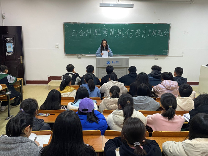 为培养同学们的诚信品质,营造优良学风考风,12月1日晚21会计班在教学楼1323教室召开了考试诚信教育主题班会,班会由辅导员汪夏萍主持,21会计班全体同学参加。