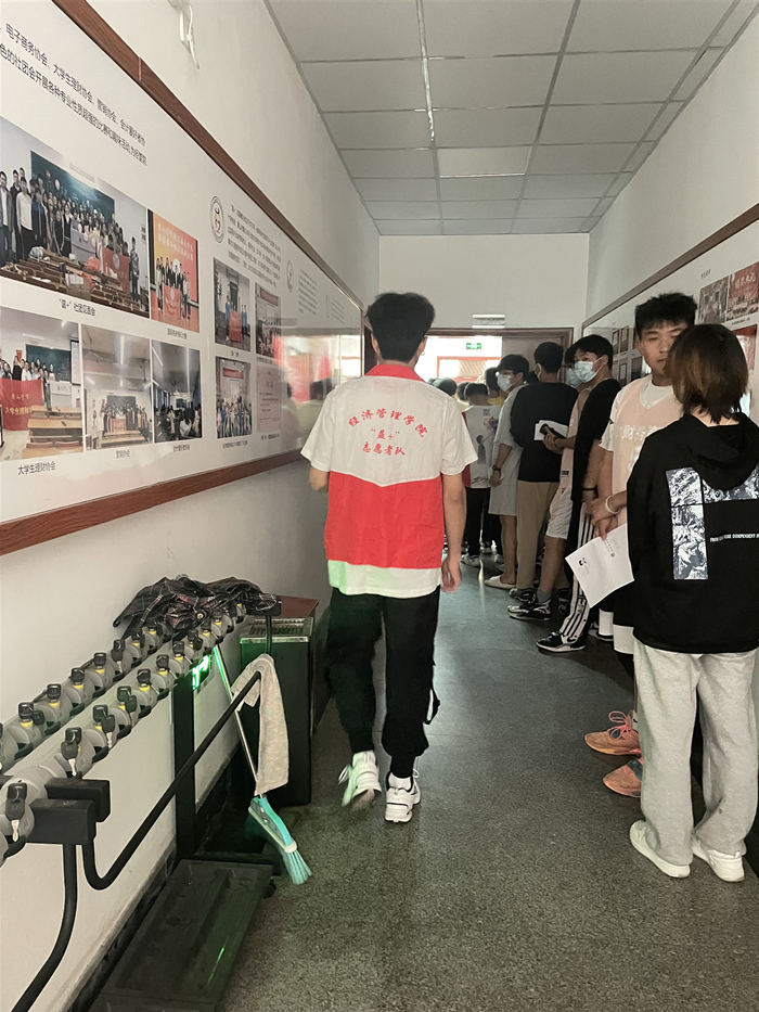 志愿者们着装整齐,有秩序的协助中国农业银行工作人员对横江校区2021级学生进行引导和秩序维护,确保信息核查工作的正常进行,同时向同学们宣传金融安全知识,提醒同学们谨防网络诈骗。