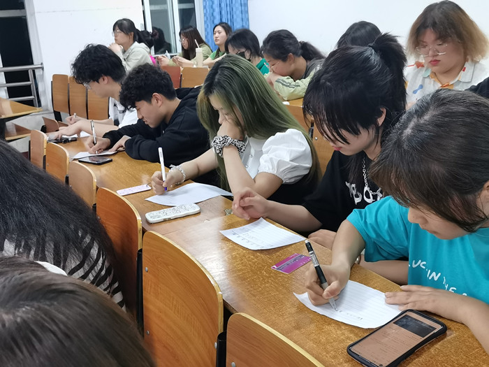金乐乐向同学们详细解读了二十大召开的背景和意义,表示了解党的二十大,是青年学生的重要活动。接着号召同学们作为青年一代,要自强不息,积极上进,永远跟党走,立大志,明大德,牢记使命,自信自励。在最后的青春寄语环节,同学们积极参与其中,在纸上写下自己对二十大的寄语,用文字表达自己对党的热爱和诚挚祝福。