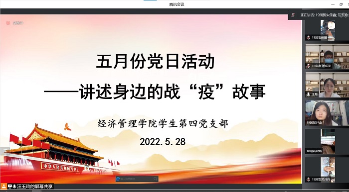 5月28日,学生第四党支部通过腾讯会议举办“讲述身边的抗疫故事”党日活动,本次活动由汪玉玲主持,支部全体党员参加。