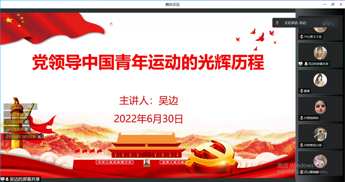 吴边向支部全体党员讲述中国共产党如何领导广大青年在革命、建设、改革不同历史时期接续奋斗、建功立业的光辉历程,并深刻诠释了习近平总书记关于青年工作的重要思想,高度总结了百年中国青年运动历程的启示,用通俗易懂的话语和实例向学生党员展示了不同时代和阶段背景下的青年精神风貌。他勉励支部党员要继续奋斗,开拓创新,团结广大团员永远跟党走、奋进新征程,不断提高自身的知识水平和修养,以朝气蓬勃的青春风采庆祝中国共产主义青年团成立100周年。