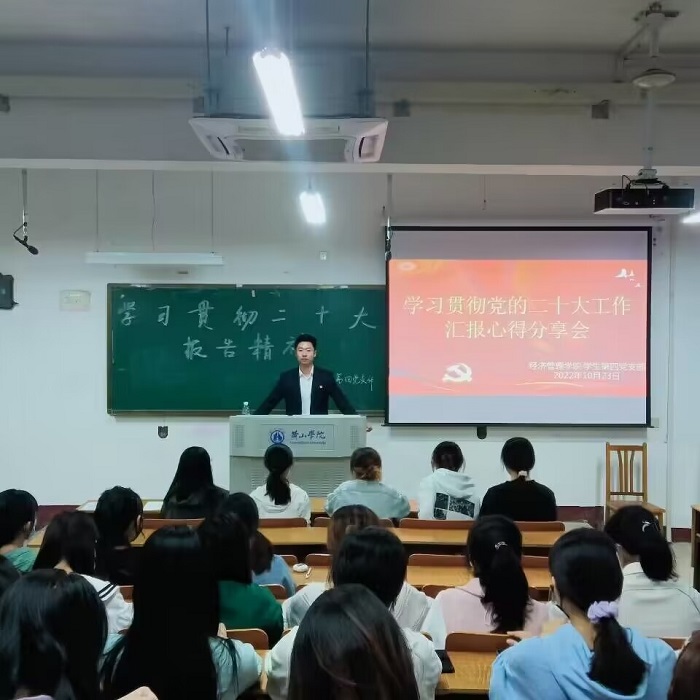 近日,学生第四党支部在横江校区1102教室开展“学习贯彻党的二十大精神心得分享会”主题党日活动,活动由施婉怡主持,支部书记吴伟航、支部全体党员与积极分子代表共同参加。