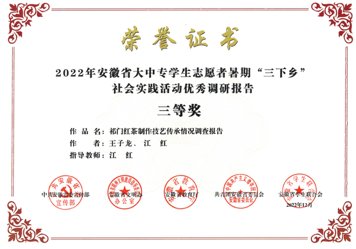 近日,taptap点点官方网站情系老兵实践团荣获2022年安徽省大中专学生志愿者暑期三下乡社会实践活动优秀实践团队称号,该院团委副书记李斌荣获省级优秀个人,由学院秘书江红指导的《祁门红茶制作技艺传承情况调查报告》荣获省级优秀调研报告三等奖。
