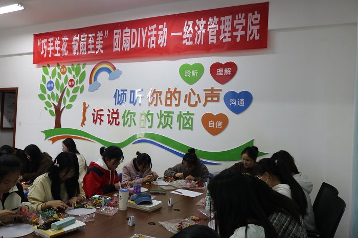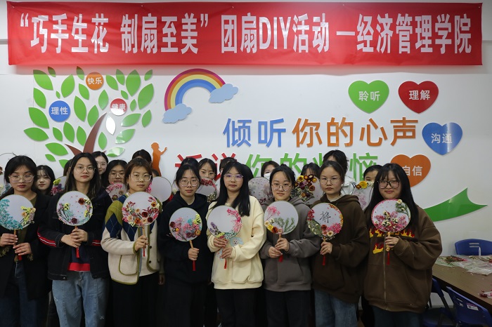 活动伊始,汪夏萍简要介绍了团扇的历史来源,紧接着,将空白团扇和材料分发给在场学生,开始动手制作环节。团扇创作过程中,在场的学生们积极投入,把花材按照自己的创意修剪形状及大小,耐心地在扇面上设计、粘贴干花,制作出一个个精美的专属团扇。制作完成后,大家纷纷拿起手机,为自己的作品拍照,留作纪念,小小的团扇给大家带来了满满的成就和喜悦。活动最后,全体成员一起合影留念。