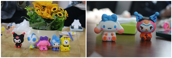 活动中,前来参加活动的同学们选择了自己想要绘画的石膏娃娃,根据示范图片或者发挥创意和想象,拿起画笔蘸着颜料开始了自己的创作,憨态可掬的背包熊、甜美可爱的美乐蒂、充满正义感的奥特曼、古灵精怪的玉桂狗,每一个石膏娃娃都凝聚着同学们的创意和思考,素白的石膏胚仿佛具有了生命。完成自己的创作后,同学们一起展示并分享了自己的作品。