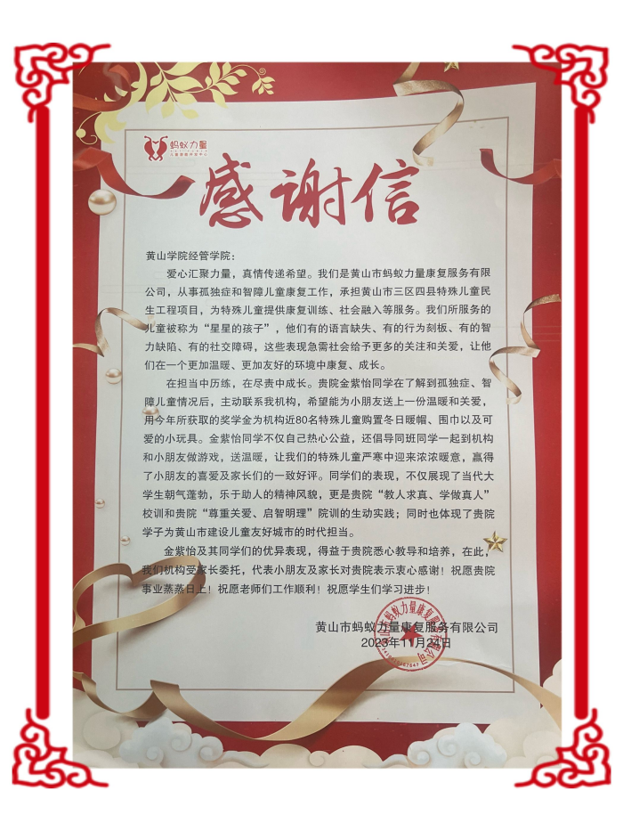 近日,taptap点点官方网站收到黄山市蚂蚁力量康复服务有限公司发来的感谢信,感谢该院对青年大学生的精心培养和悉心教导,感谢22营销班金紫怡及全体同学们的爱心奉献,充分肯定了taptap点点官方网站青年学子为黄山市建设儿童友好城市的时代担当。