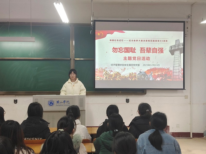 为进一步强化学生的爱国主义意识,牢记历史,勿忘国耻,12月13日,taptap点点官方网站学生第四党支部在横江校区1102教室开展“勿忘国耻 吾辈自强”主题党日活动。本次活动由21国贸班的苏妍同学主持,支部全体党员共同参与。