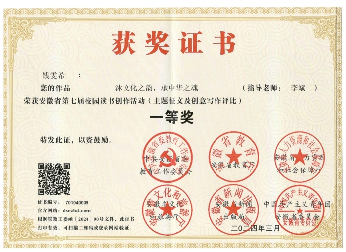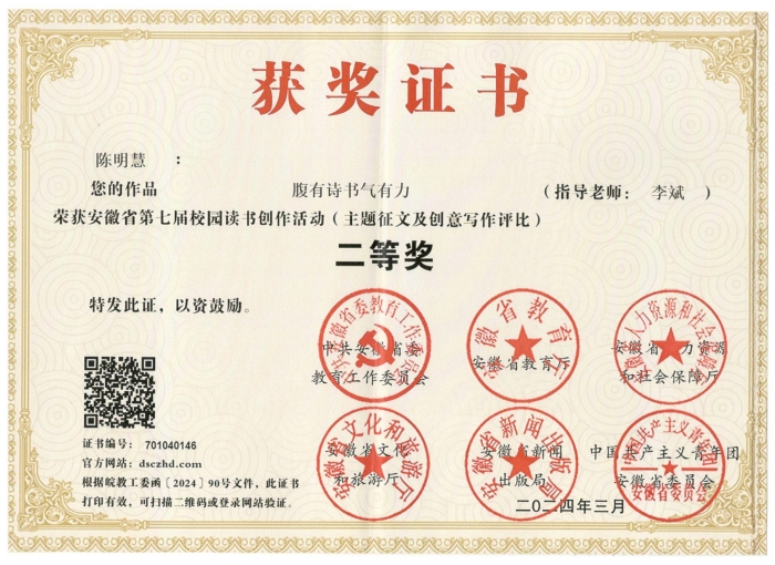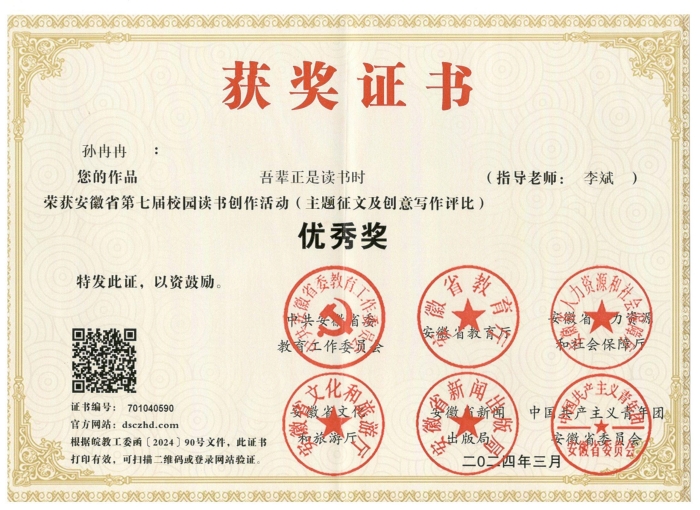 3月27日,由省委教育工委、省教育厅、省人力资源和社会保障厅、省文化和旅游厅、省新闻出版局、团省委共同主办的安徽省第七届校园读书创作活动结果公布,我院学子在读书创作活动项目中喜获佳绩,共有4名学生获奖,分别是2023级财务管理专业答晓雪、钱雯希荣获一等奖,2023级市场营销专业陈明慧荣获二等奖,2023级电子商务专业孙冉冉荣获优秀奖。