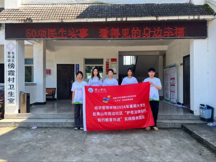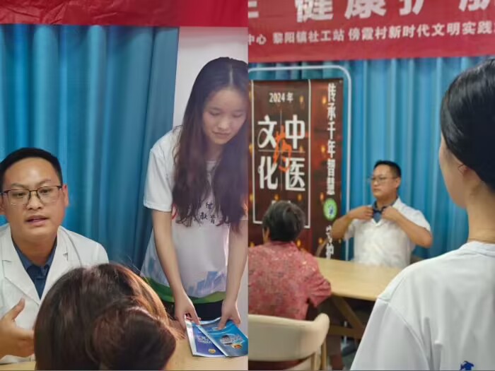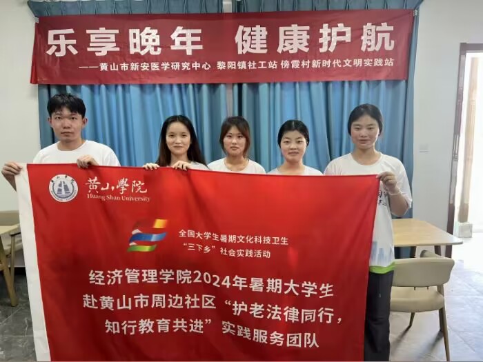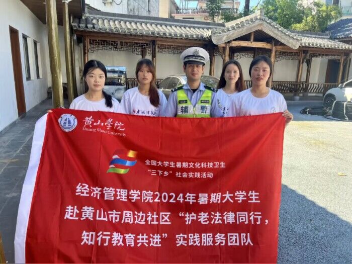 7月5日,团队根据预先安排好的计划,前往黄山市屯溪区黎阳镇傍霞村村委会对当地老人进行反诈骗宣传和交通安全知识的普及以及协同社区开展“乐享晚年,健康护航”中医义诊活动。