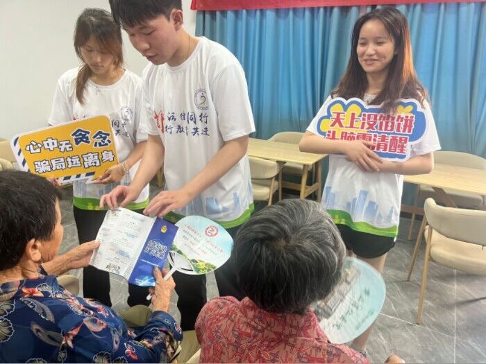 团队成员在布置好活动现场后,为到场老人派发防诈骗宣传册,并口述列举相关老年人诈骗案例,提醒大家“天上没馅饼,头脑需清醒”,要做到“心中无贪念,骗局远离身”。