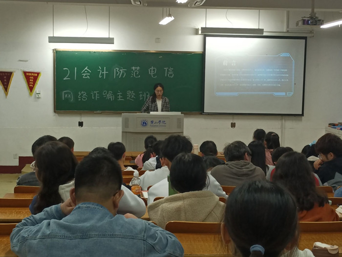 2022年3月30日至3月31日,21财管班、21财管专升本班,21会计班和21国贸班在各自班级的责任教室召开“防范电信网络诈骗”主题班会。班会由辅导员汪夏萍主持,各班全体同学参加。