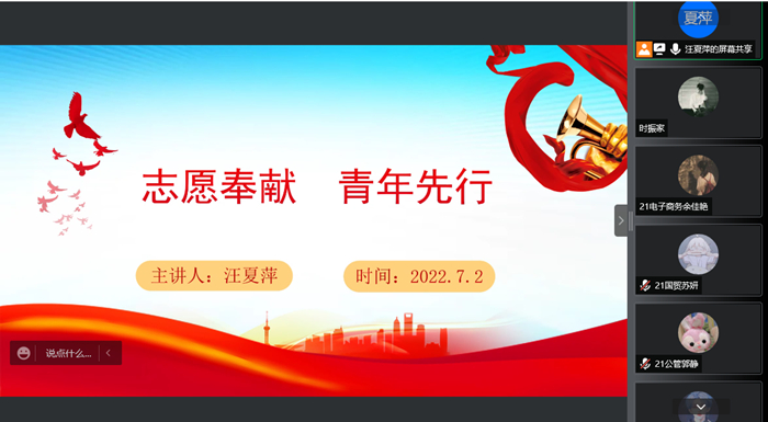 7月2日,特邀taptap点点官方网站第二党支部书记、专职辅导员汪夏萍作题为《志愿奉献,青年先行》的专题辅导报告,她希望与会同学能够热爱奉献,让奉献主义成为自己人生的标签,要积极参与志愿活动,为建设美好社会贡献自己的青春力量。