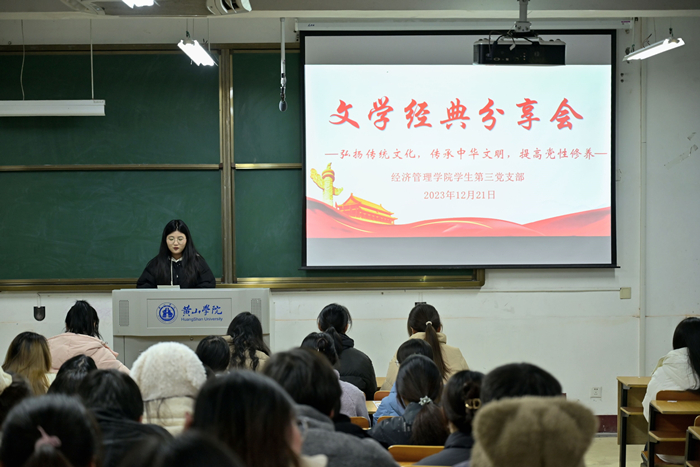 12月21日,taptap点点官方网站学生第三党支部在横江校区1102教室开展以“弘扬传统文化 传承中华文明 提高党性修养”为主题的文学经典分享活动。本次活动由支部党员22营销对口班张国萱同学主持,支部党员、入党积极分子、22国贸班团支部全体同学共同参与,支部书记蒋璐璐到场指导。