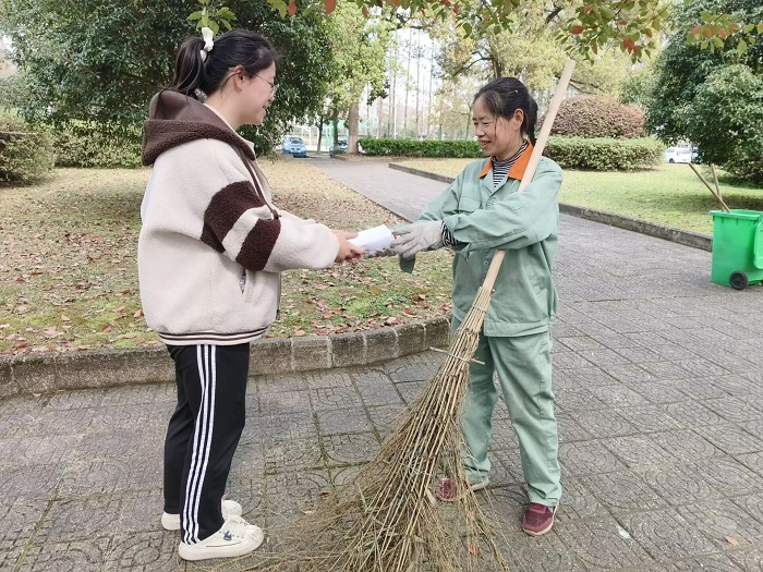 活动伊始,张芊羽以雷锋精神内涵为落脚点,从雷锋事迹和实践活动展开描述,引导同学们对雷锋精神的时代价值进行思考。随后,同学们在1203教室写下准备给校园内保卫工作人员、宿管阿姨和环卫工人的信。最后,同学们带着亲手写的信以及矿泉水向守卫在学校的每一个角落里的后勤保卫工作者们表达敬意和感谢。同学们将一瓶瓶矿泉水递到了他们的手上,看着他们露出灿烂的笑容,同学们的心里也是温暖的。
