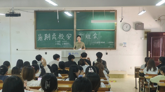 班会上,吴伟航老师传达了学校关于暑假安全管理的相关文件精神,强调了关于安全教育的几项注意事项。第一,离校前提醒大家认真按照学校学生公寓及学生手册规定,注意用火、用电安全,做到断电、锁好门窗、收好贵重物品。第二,离校过程中注意人身安全、财产安全、交通安全,乘坐正规车辆,结伴同行;第三,提醒同学们要提高安全防范意识,坚决不到有安全隐患的地方游玩;假期勤工助学或实习时,做好个人防护,增强法律意识和防盗、防骗、防溺水意识,提高自我保护能力。