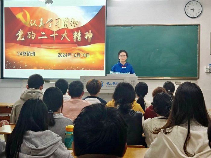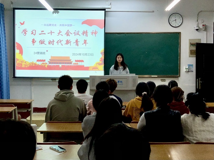10月18日,24营销团支部开展“党的二十届三中全会精神”宣讲活动。丁怡丹带领团员们观看紧扣党的二十届三中全会主题的视频,解读了全会的主要内容、重大意义和精神实质,引导团员青年深刻认识国家的发展方向和个人的努力方向。同学们反响热烈,表示要统一思想和行动,落实全会精神,以务实和积极的态度投身于各项工作和学习中,勇于探索、敢于创新,为社会发展注入源源不断的青春活力。