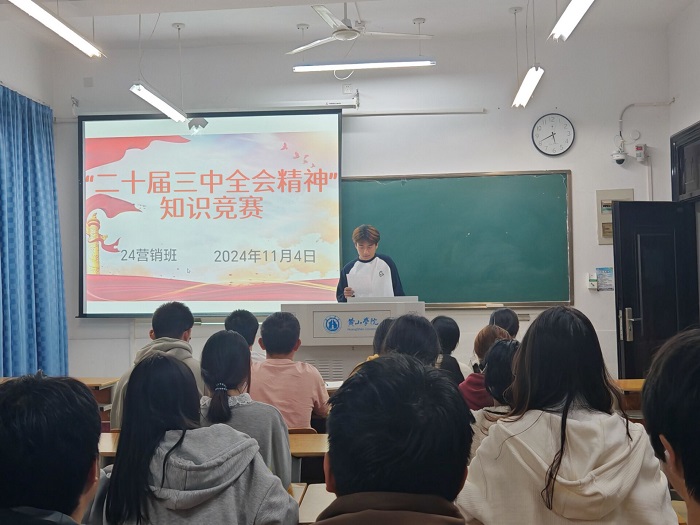 11月4日,24营销团支部开展“党的二十届三中全会精神”知识竞赛活动。郝浚杰同学担任本次活动的主持人。此次知识竞赛涵盖了党的二十届三中全会的核心内容、主要精神及相关背景知识,旨在检验同学们对会议精神的了解程度。在比赛过程中,同学们不仅展现出对党的二十届三中全会精神的深刻理解,还积极分享自己的见解和看法,展示出了新时代大学生的精神风貌。此次知识竞赛的成功举办,不仅是学习党的二十届三中全会精神的一次生动实践,还激发了同学们的学习热情,为加深政治理论学习注入新的动力。